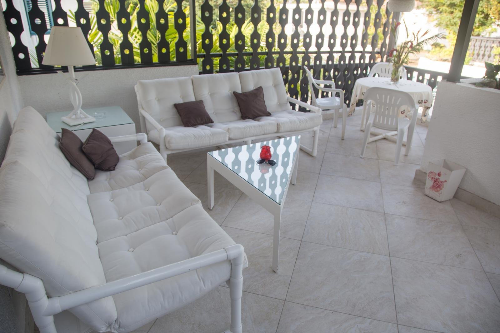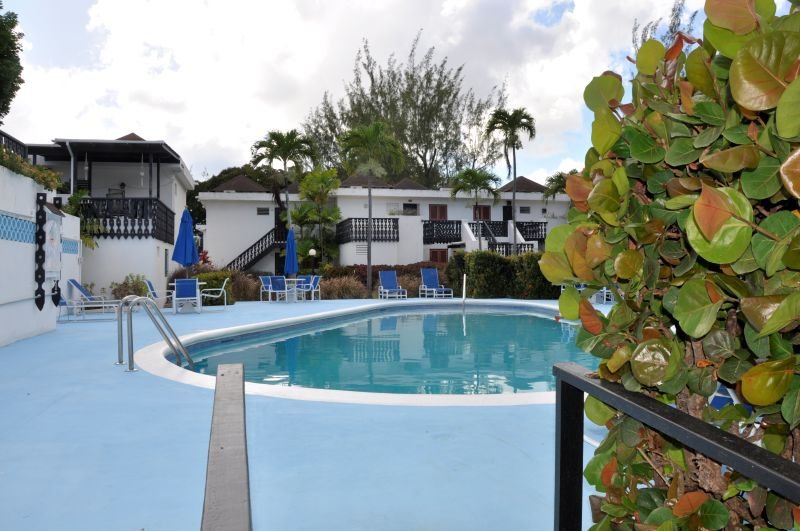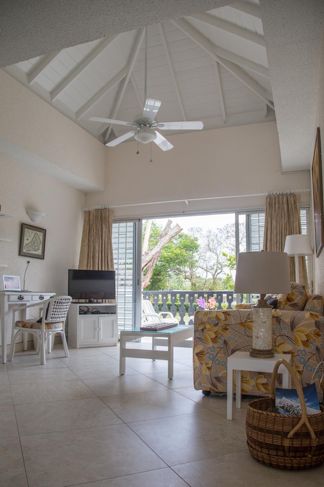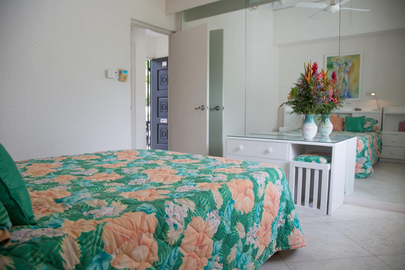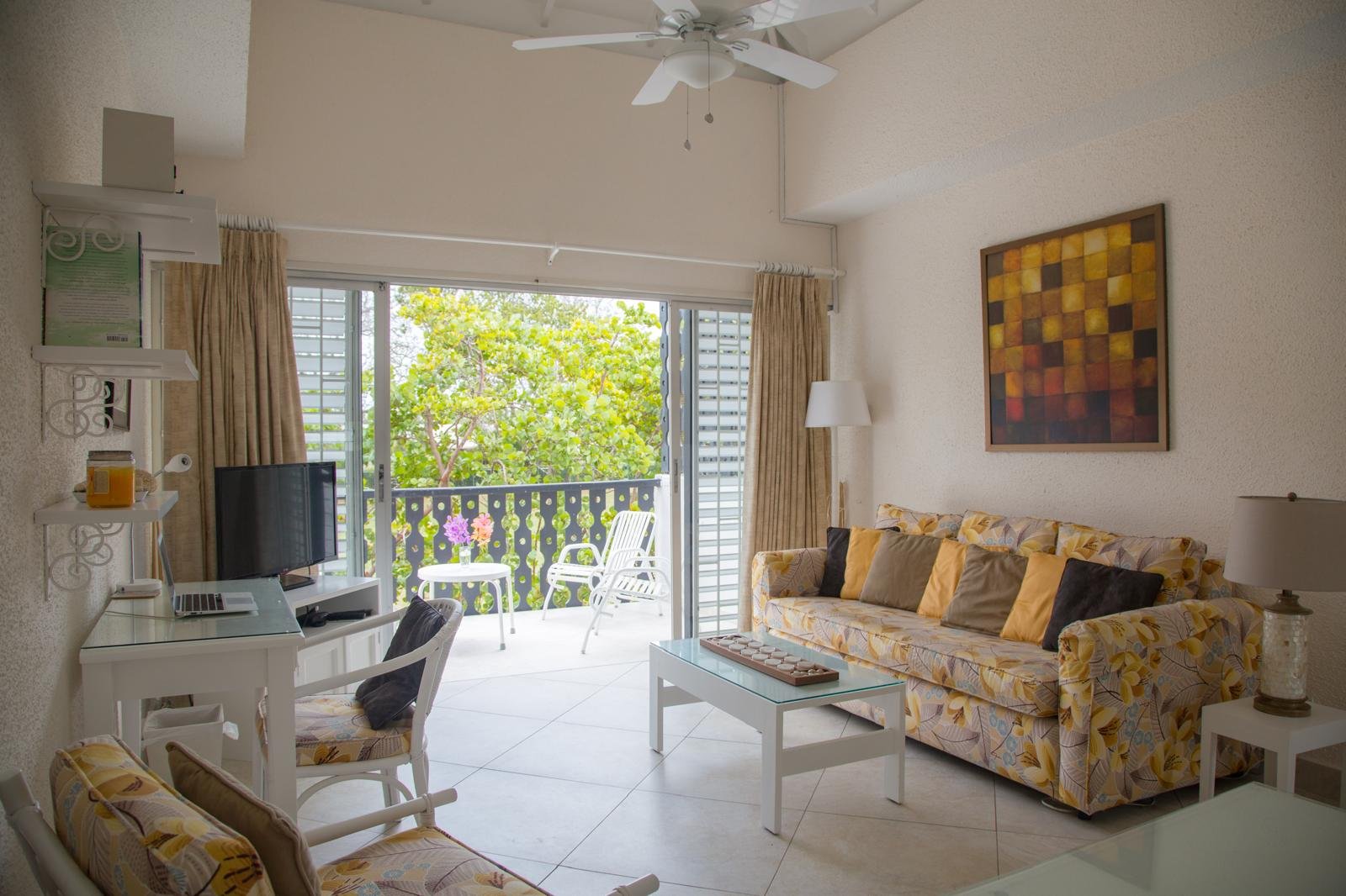 Golden Grove 235 is a fabulous 1-bedroom 1-bathroom property, which is becoming available for the first time in 32 years and offers a number of special features. Its location in the centre of the Golden Grove cluster offers an undisturbed view of the 1st Fairway of the Rockley Golf course on one side and of the picturesque pool on the other. It faces both East and West, allowing for lovely morning and afternoon light and a refreshing cross-breeze throughout the day. Being on the upper first (American second) floor, both living and bed rooms feature high dome-shaped cathedral ceilings which give the apartment a spacious and airy feel. Most notably, this property also comes with a rarely available very spacious and fully covered second patio. Overlooking the pool and boasting its own elevated plant bed of succulents, this space makes for a wonderful second living room, lounging, outdoor dining and entertainment area.
