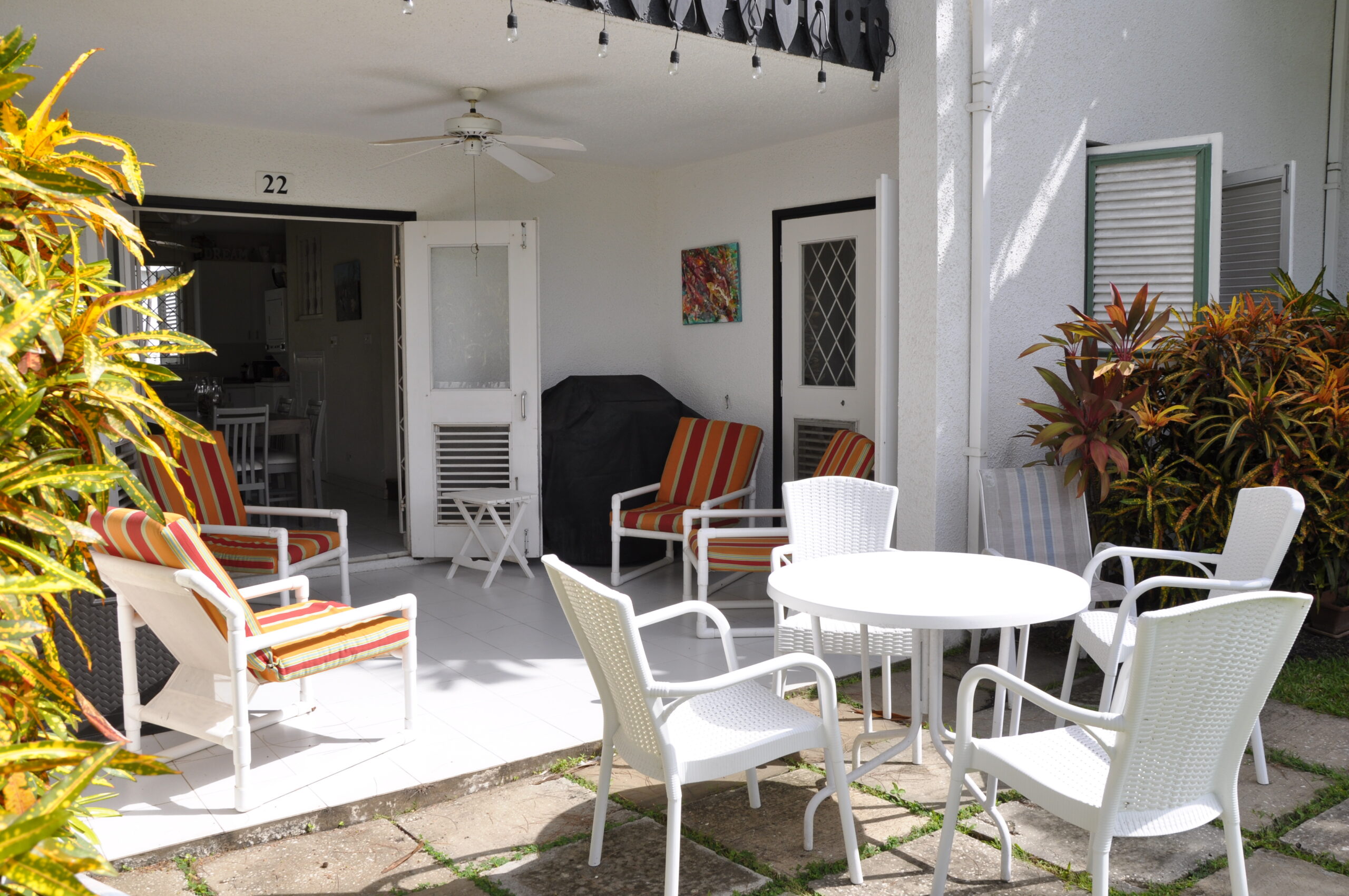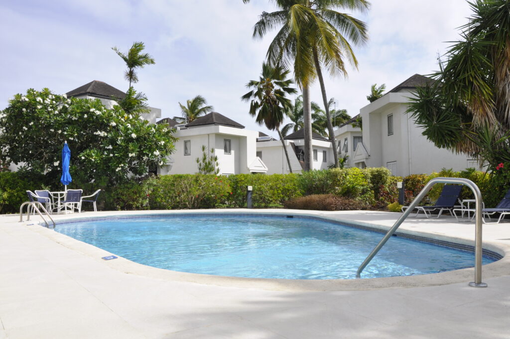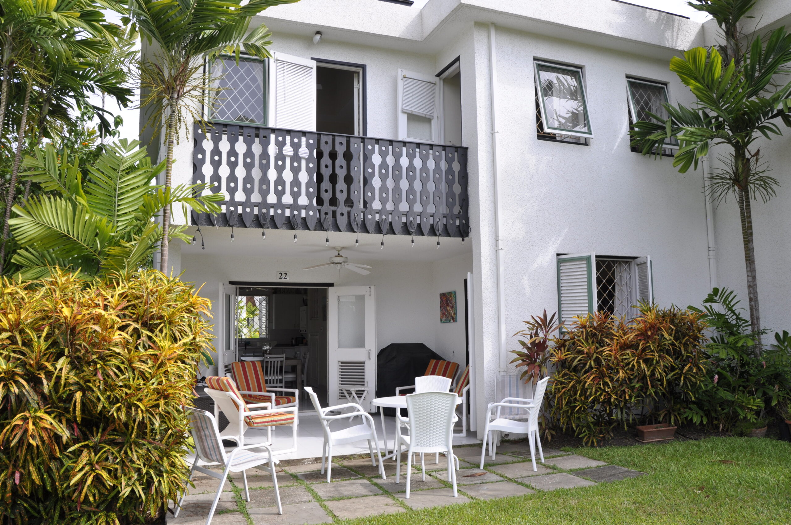 Harmony Hall No. 22 is a three bedroom, two and a half bathroom townhouse, located in the popular Rockley Golf & Country Club in Barbados. The ground floor offers a powder room, generous living area as well as an open plan kitchen and dining room, all leading on to the covered patio. The patio offers wonderful views of the 5th Fairway of the Rockley Golf Course.